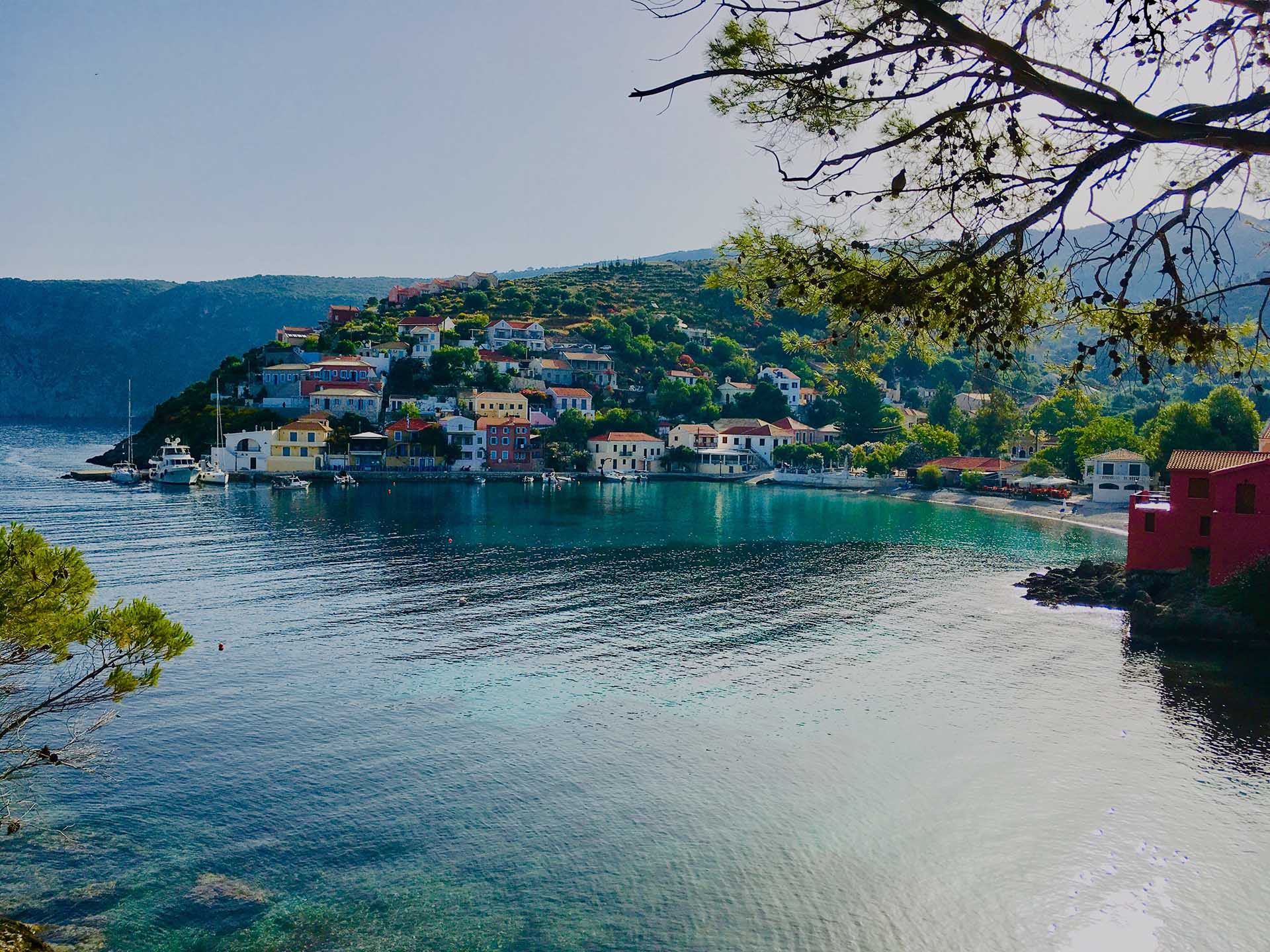 Myrtos Beach. One of the most photographed beaches in all of Greece is in Kefalonia. On the island’s northwest coast, near Assos, Myrtos is beautiful. The two-kilometer-long beach is backed by dramatic limestone cliffs and fringes an amazing turquoise-blue sea. It’s made of smooth white pebbles that, from afar, resemble sand. The view from the road above is stunning.
