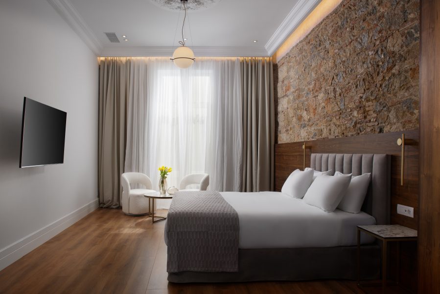 It is worth noting that this building housed the former Atheneum Conservatory in honor of Maria Callas. With absolute respect to the history of the building, the hotel preserves characteristic elements of neoclassical architecture such as the high-ceilinged rooms and the plaster decoration on the ceilings, as well as the mural-map in the inner courtyard. In addition, in the context of the restoration, special attention has been paid to highlighting the interior stone walls of the building in order to maintain an imaginary communication between the past and the present.