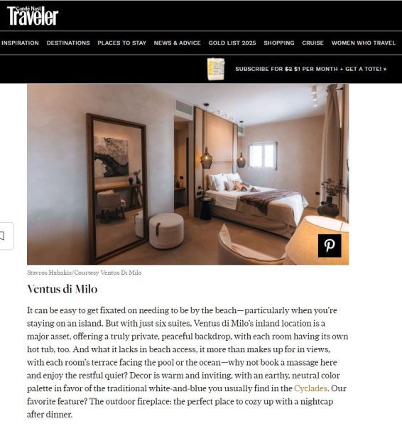 Ventus di Milo has been featured in Condé Nast Traveler as one of the best hotels in Milos. Highlighted for its serene inland location, luxurious private suites, and stunning terrace views, the boutique hotel offers an exclusive retreat for travelers seeking peace and comfort. With its warm, earthy decor, private hot tubs, and an inviting outdoor fireplace, Ventus di Milo stands out as a top accommodation choice on the island.