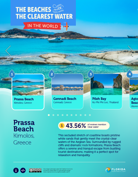Kimolos, a serene island in the Cyclades, has earned global recognition for its natural beauty — with Prassa Beach recently ranked #1 worldwide for the cleanest waters, according to a study by the travel site Florida Panhandle. Based on an analysis of over 2.4 million traveler reviews, the study revealed that 43.56% of comments about Prassa Beach specifically praised its crystal-clear waters — the highest percentage of any beach globally. This impressive distinction shines a spotlight on Kimolos as a rising destination for authentic, nature-inspired travel.
