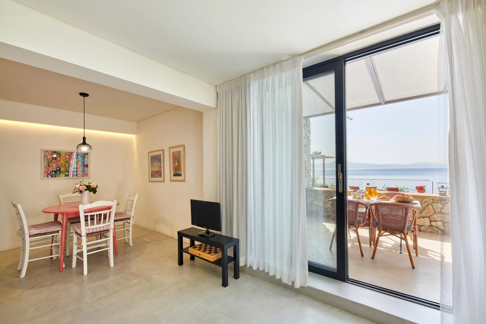 Apartment Number One (48 sq.m.) is on the second level of the property, offering breathtaking views of the Messinian bay. It includes the master bedroom with a private balcony and en-suite bathroom and a second open space twin bedroom, a large living room, and a dining area leading to its own private terrace.