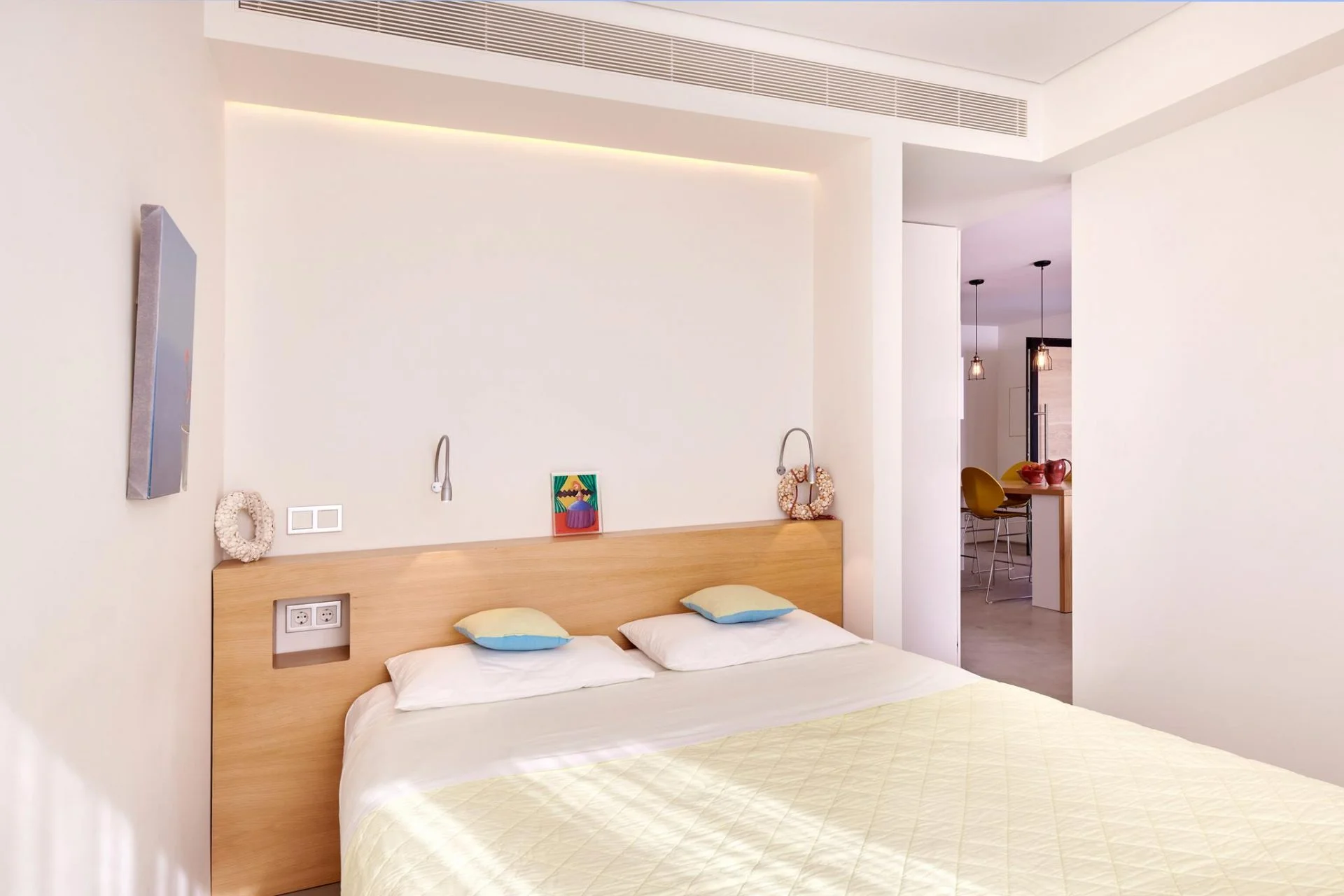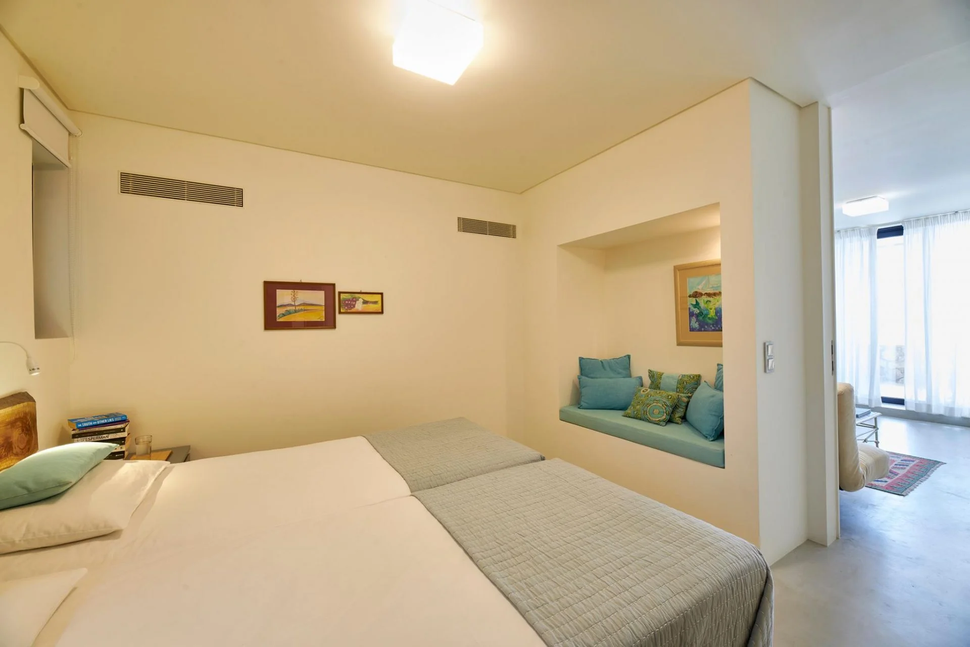 Apartment Νumber Τhree (34 sq.m.) is on the ground level. It features a master bedroom with a walk-in wardrobe. There is a spacious living room with a sofa bed, leading to a private balcony with views of the swimming pool and sea.