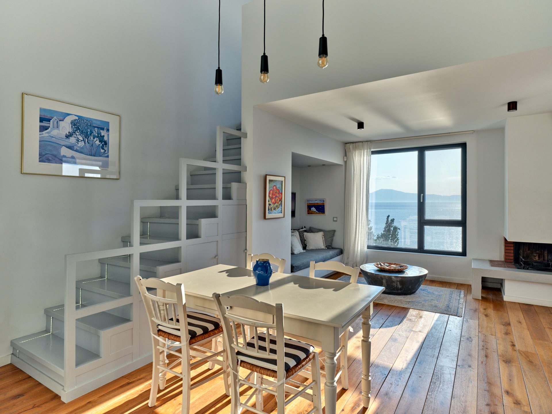 Apartment Number One (48 sq.m.) is located on the second level of the property and offers breathtaking views of the Messinian Bay. It features a master bedroom with a private balcony and en-suite bathroom, as well as an attic twin bedroom accessed by a few stairs. The apartment also includes a spacious living room and a dining area that opens onto its own private terrace.