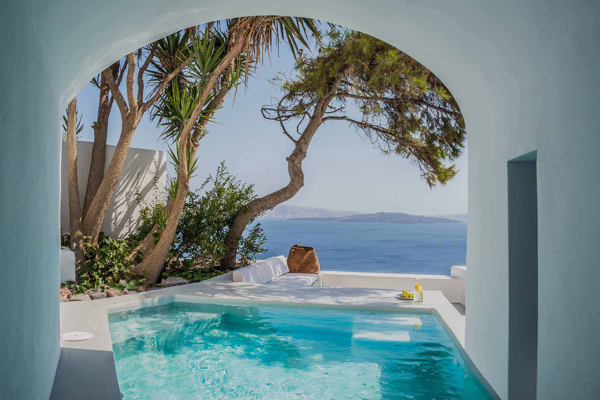 With its breath-taking views over the Oia cliffs, the Pina Caldera Residence is a stunning hideaway for any visitor to the beautiful island of Santorini. The pine tree in the property’s garden is a rare sight on the island and signals exclusivity with characterful charm.