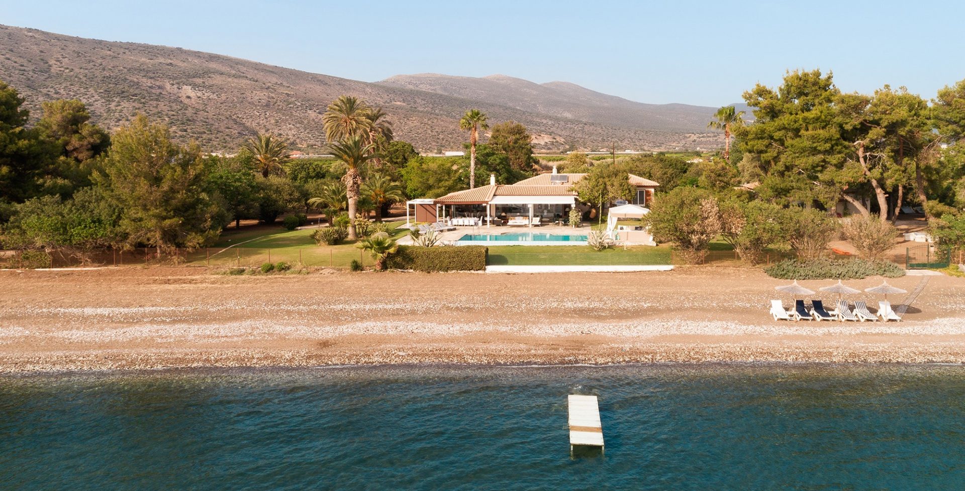 Situated at the Peloponnesean coast between Porto Heli and Nafplio, this villa is a magnificent beachfront mansion that carries its splendor with disarming simplicity. A summer house that’s sophisticated and laid back at the same time, this 6 bedroom residence is literally a few steps away from the water.